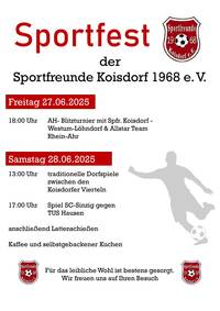 Die Sportfreunde Koisdorf feierten am 27. und 28. Juni 2025 wieder ihr Sportfest im Waldstadion Koisdorf. Los ging es mit einem Blitzturnier am Freitag. Angetreten sind drei AH-Mannschaften mit Allstar-Team Rhein-Ahr, Westum-Löhndorf und die Gastgeber Koisdorf.